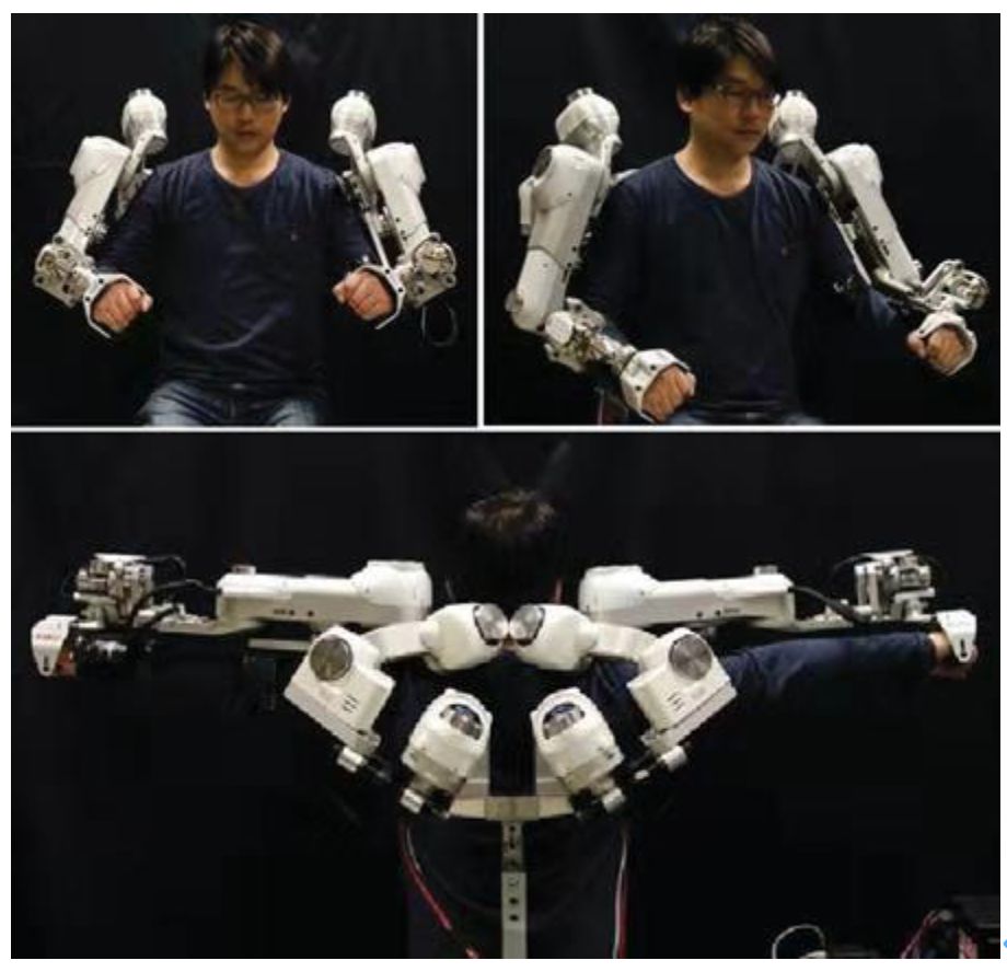 双臂康复机器人主要分为两种,一种是末端牵引式机器人,一种是外骨骼式机器人。早期研究的上肢康复设备是基于末端效应机器人设计,它是通过牵引病人的手或前臂的一个点进行训练,外骨骼机器人通常具有类似于人的肢体的运动结构,为患肢提供重力补偿,具有多个自由度,可以协助患者上肢关节进行复合运动。它不但可以实现高强度,高稳定的重复式训练,而且能够精确的保证训练效率和强度。